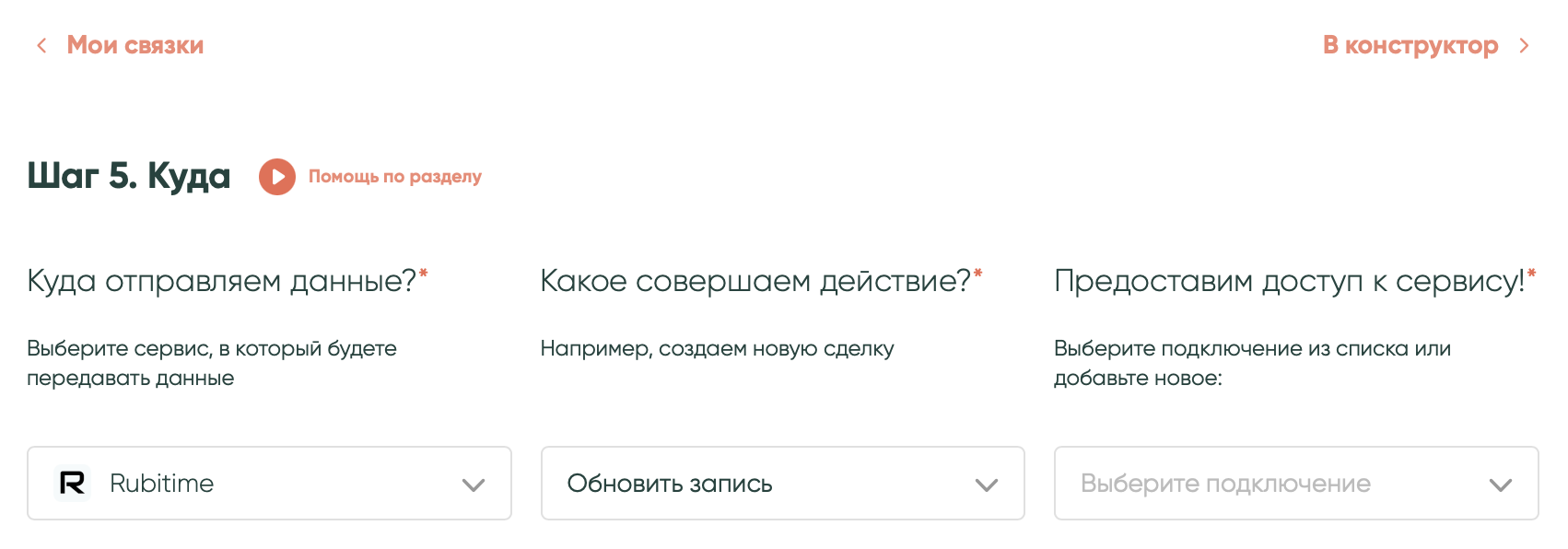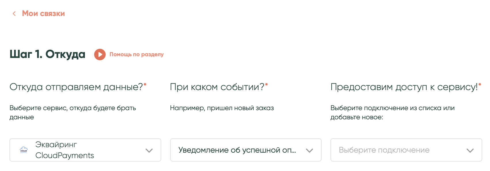 2) Создайте новую связку: выберите источник данных и событие (например: CloudPayments -> Уведомление об успешной операции), а затем приемник данных и действие (например: Rubitime -> Обновить запись).