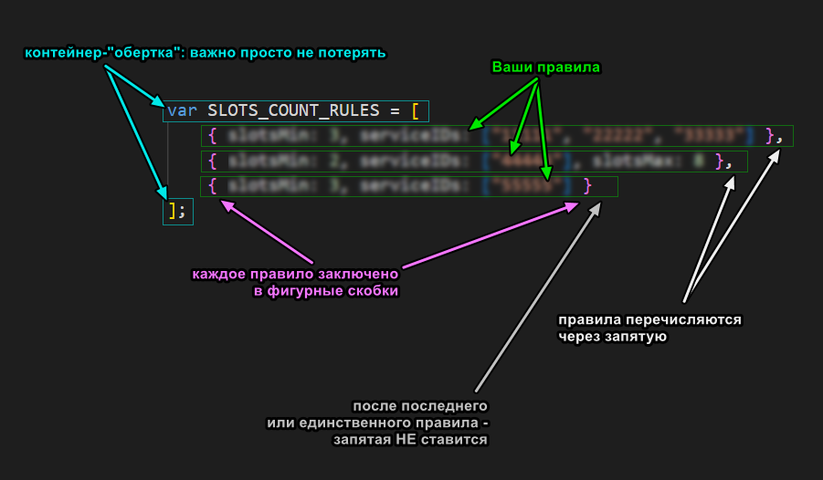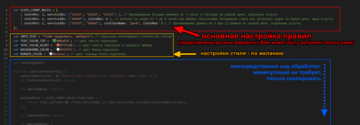 Полностью скопируйте приведенный ниже код в раздел "Настройки -> Дополнительные CSS/JS -> JS", заменив содержимое конструкции var SLOTS_COUNT_RULES = [ ]; на Ваши правила: