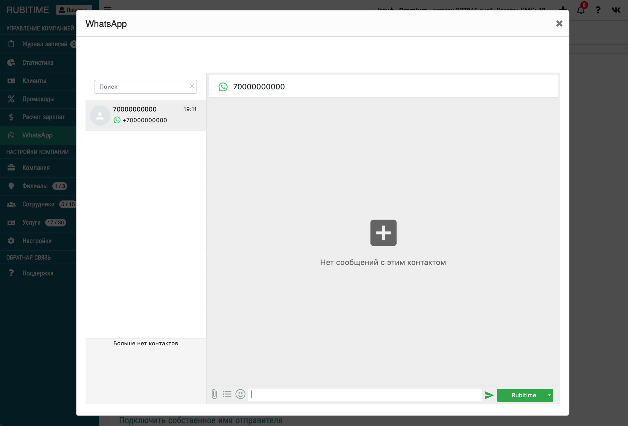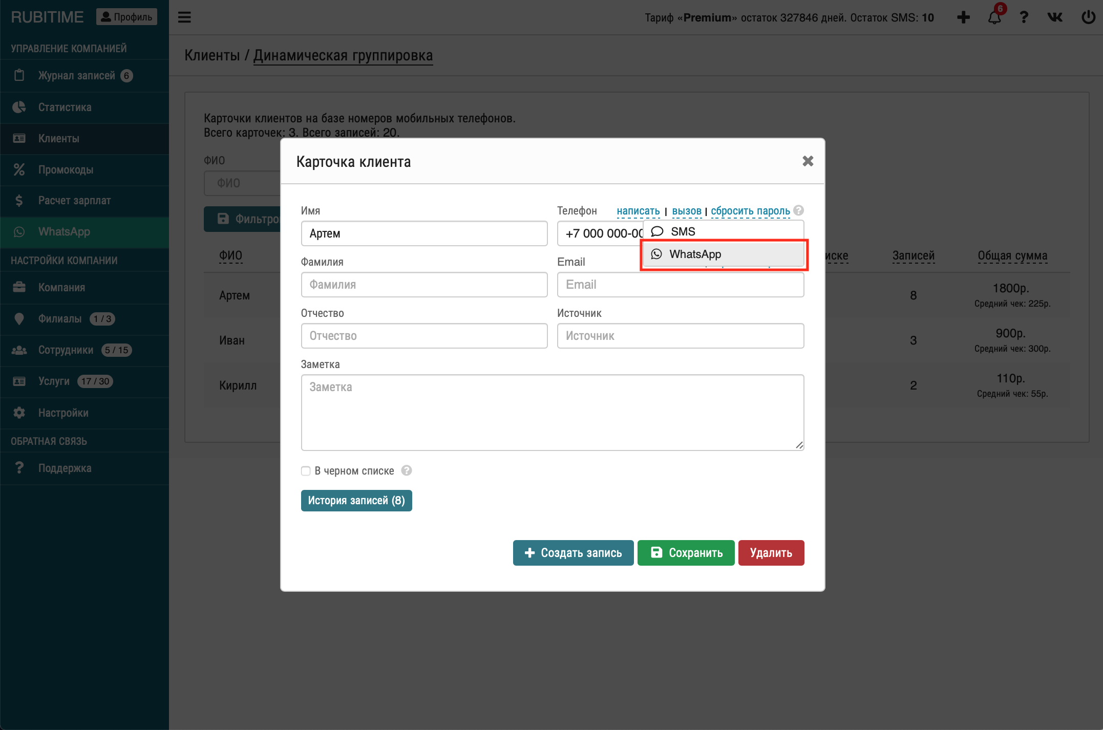 Готово! Теперь Вы можете открыть WhatsApp по ссылке в блоке навигации слева, либо написать конкретному контакту через кнопку "написать" при просмотре клиента в разделе "Клиенты" или "Журнал записей" при просмотре записи: