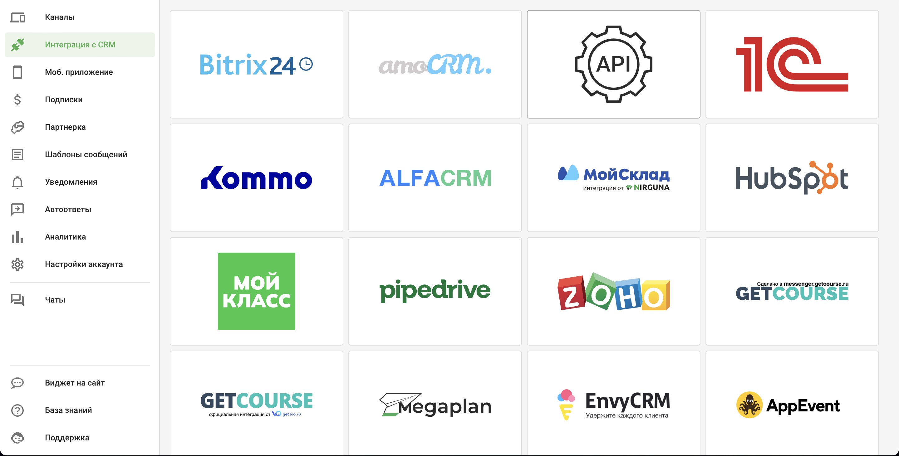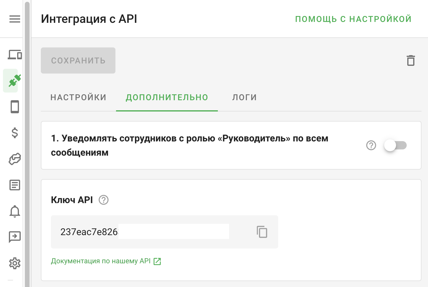 3. Перейдите в раздел "Интеграции с CRM", выберите API: