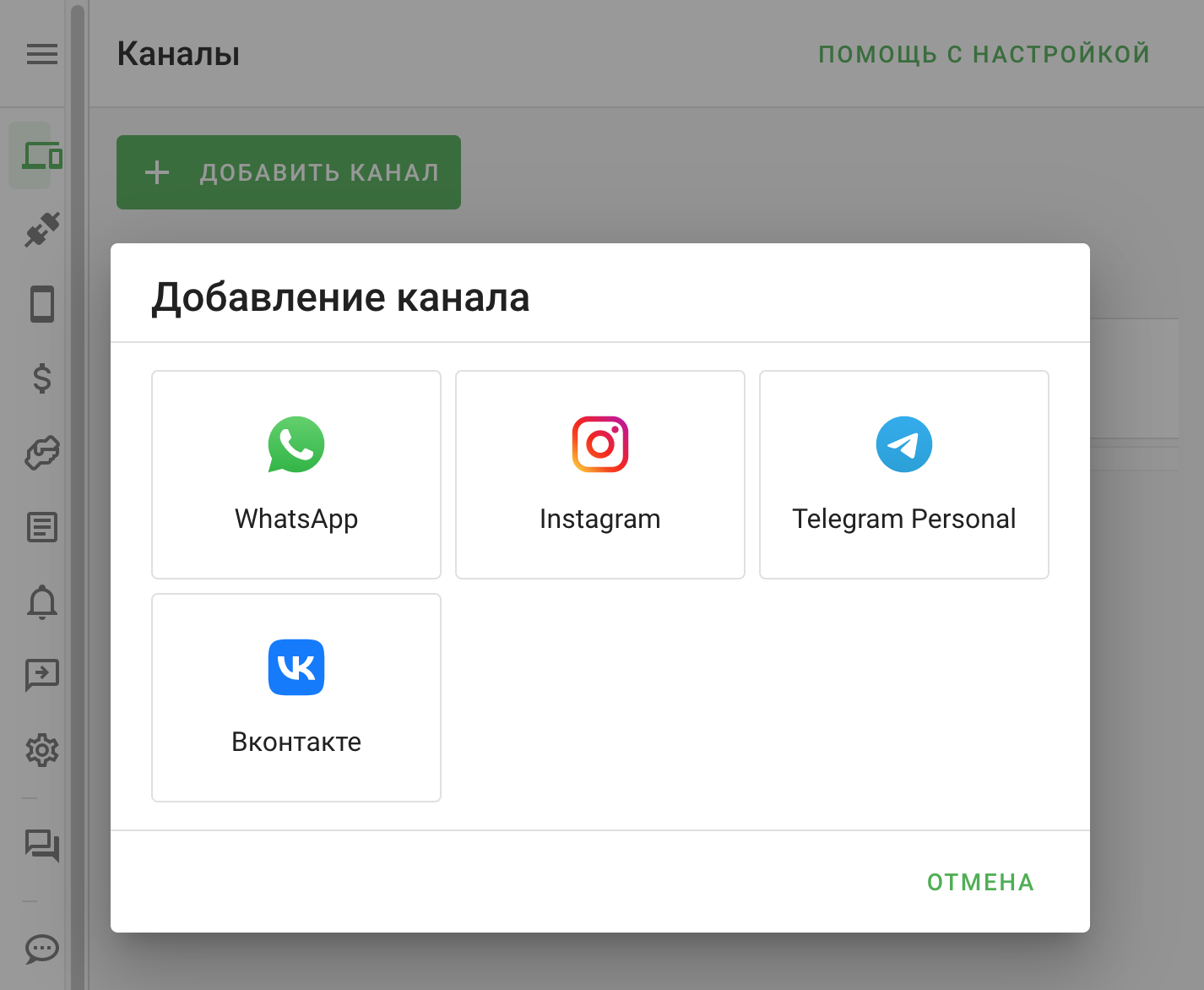 2. В разделе "Каналы" - выберите WhatsApp, нажав кнопку "Добавить канал":