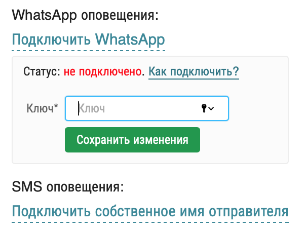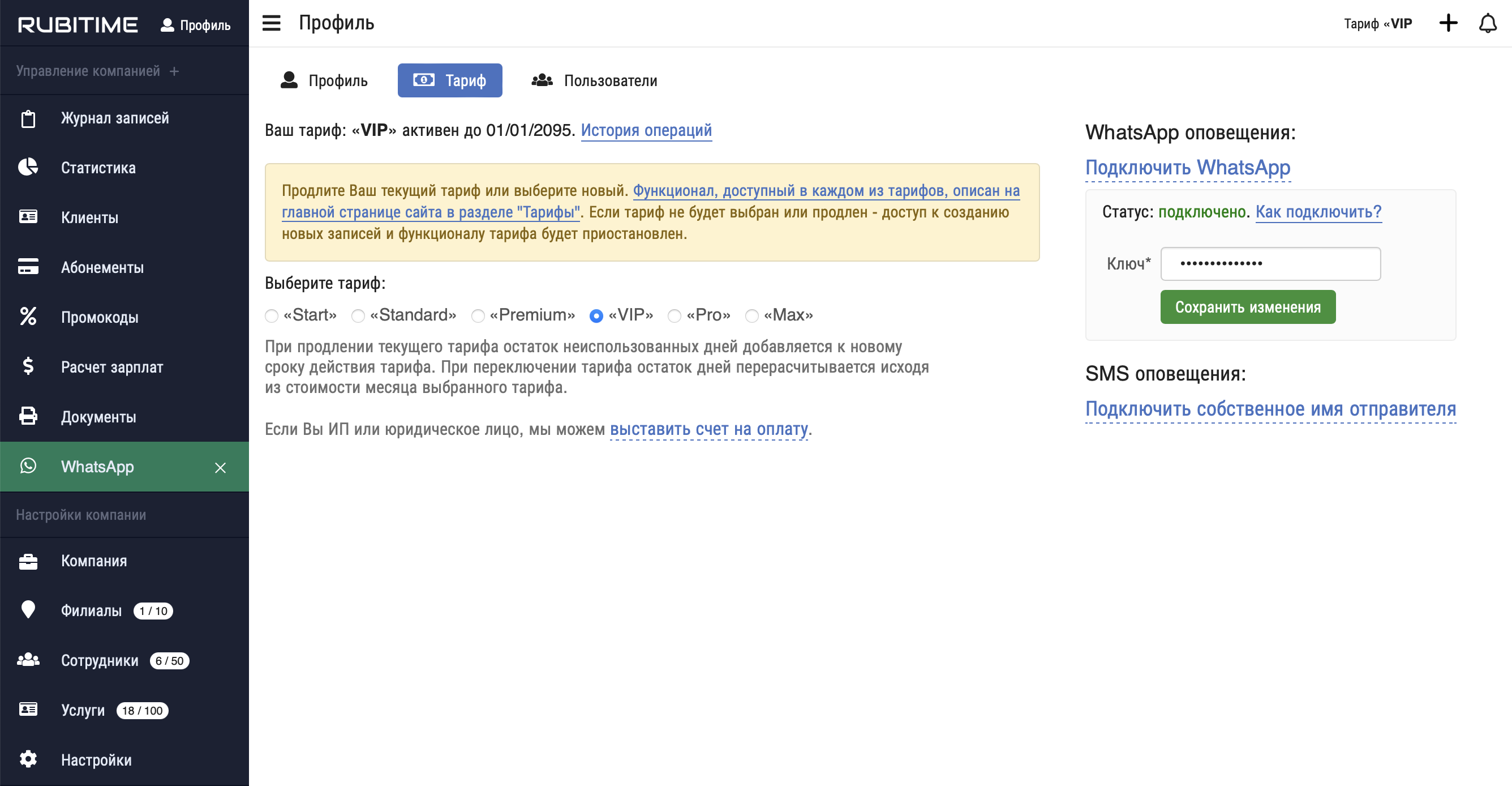 4. Полученный API ключ с предыдущего шага вставьте на наш сервис Rubitime в раздел: "Профиль -> Тариф -> Подключить WhatsApp" в поле "Ключ" и нажмите кнопку "Сохранить изменения":