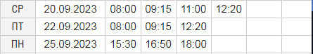 В первом столбце заполняется дата каждого рабочего дня, а вправо от даты - последовательно начало каждого слота времени для записи, например: